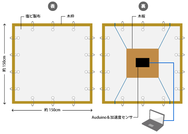 裏側には、ぶら下げた木板の中央に、加速度計付きのArduinoを貼り付けてあります。このように、木版に加速度計を取り付けて設置することで、振動を感知するエリアを限定できないかと考えたわけです。この木版の範囲にボールが当たったときと、木版が無いところにボールが当たったときで、取得できる加速度データに違いがあるのかどうかを確かめます。木版に当たった場合は、瞬間的に激しい加速度が発生し、木版から外れた場合は、塩ビ布が振動を吸収してくれて加速度は感知されない・・・という結果を期待しています。