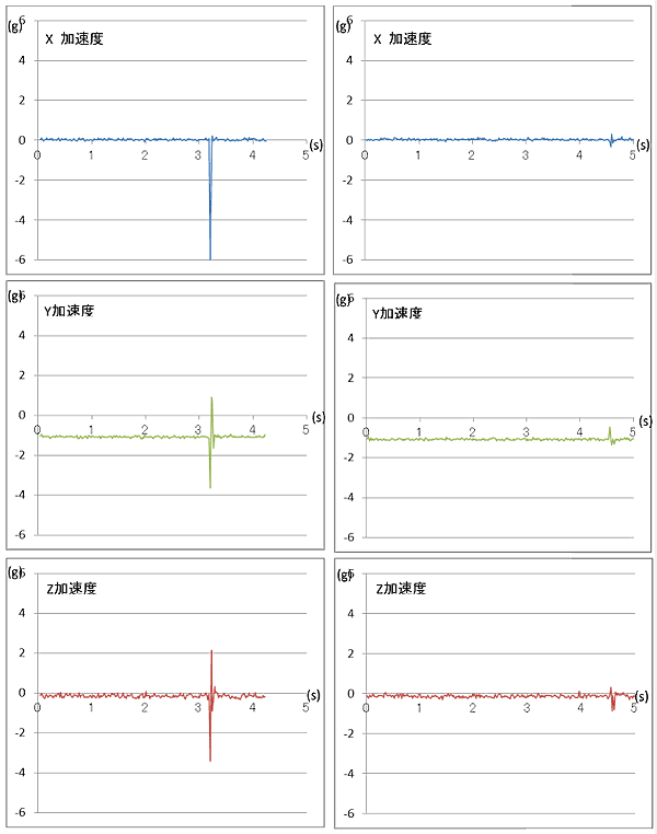 左列のグラフが「木版にボールが当たった場合」、右列は「木版からは外れたが塩ビ布には当たった場合」の結果です。上から順に、X,Y,Z方向の加速度を表しています。ボールが木版に当たった場合を見てみると、ボールが当たった瞬間に大きな加速度を感知していることがわかります。それに対してボールが木版から外れた場合は、若干の加速度を感知しているものの、木版に当たった場合とは明らかに結果に差があることがわかります。このほかにも、「木版にボールを強め/弱めに当てた場合」、「木版の近いところ/遠いところで外れた場合」などのデータを取得しましたが、見事に木版に当たったときだけ瞬間的な強い加速度を感知することができました。