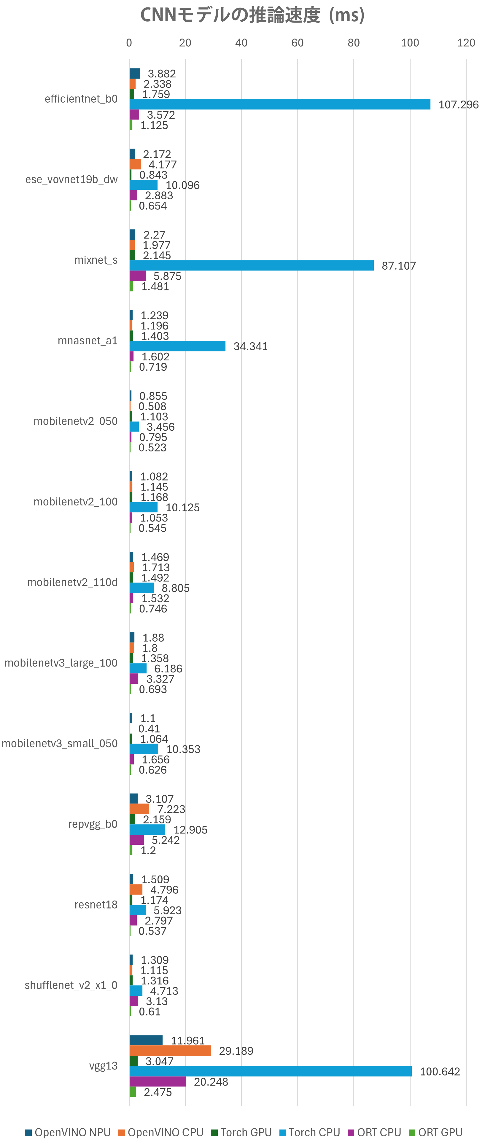 それぞれのCNNモデルについて、上から順にOpenVINO(NPU)、OpenVINO(CPU)、Pytorch(GPU)、Pytorch(CPU)、ONNX Runtime(CPU)、ONNX Runtime(GPU)を使用したときの推論速度(単位ms)で表したものになります。