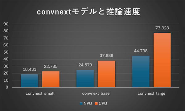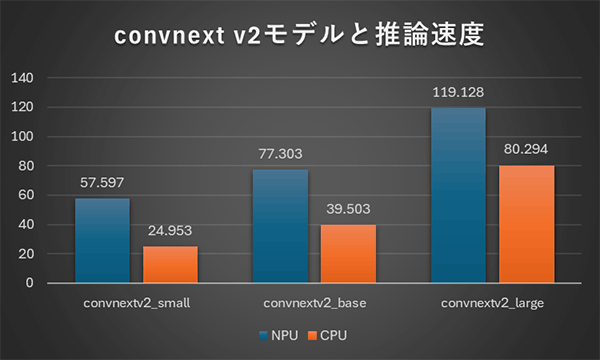 上記の左はconvnextモデル、右はconvnext v2モデルに対する推論速度の結果になります。CPUでの推論はconvnext、convnextv2共にそれほど違いはないですが、NPU推論時間はv2になると大幅に増加しています。