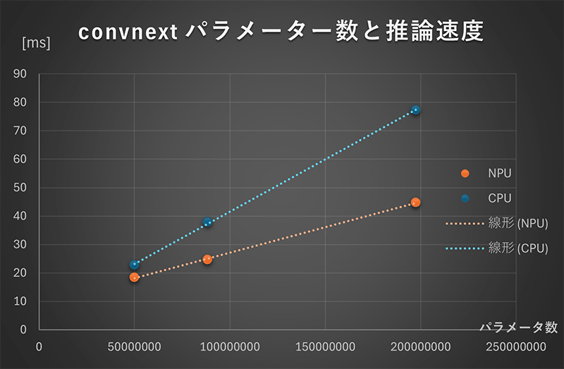 NPU、CPU共にパラメータ数と推論にかかる時間はある程度比例関係にようですが、パラメータ数が多くなるほどNPUを使う恩恵が大きくなるようです。