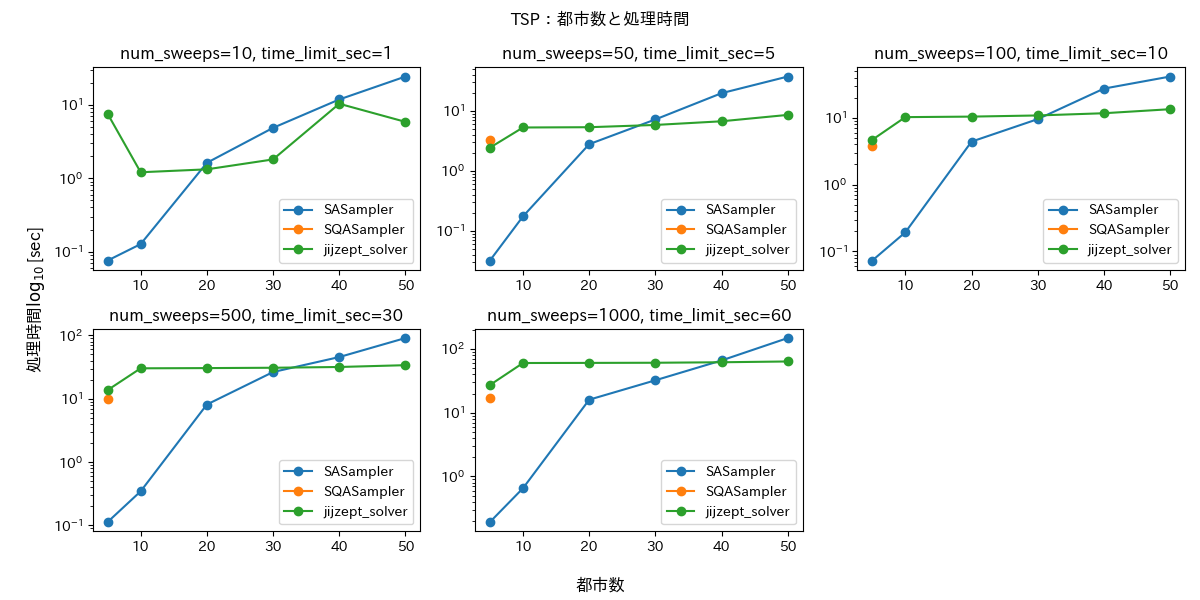 num_sweeps および time_limit_sec を変えながら、同じ問題を3つのソルバーで解いて (1)処理時間と (2)目的関数の値を比較します。