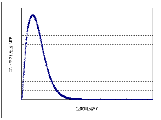 さて、人間の目の MTF を見てみます。空間周波数 f と視覚系のコントラスト感度 MTF をグラフ化すると、次図のようになります。