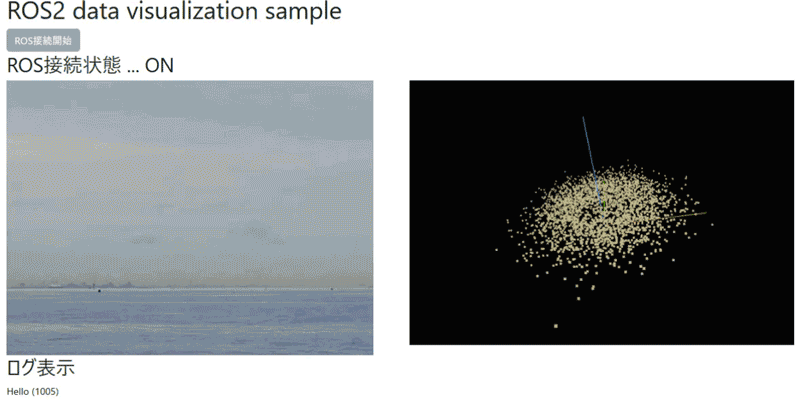 「ROS接続開始」ボタンでサーバ側と繋ぐと、送られてきた点群データが順次表示されることが確認できます。