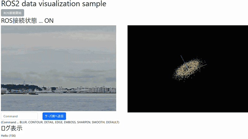 「ROS接続開始」ボタンでサーバ側と繋ぐと、これまでと同様に画像と点群が表示されます。